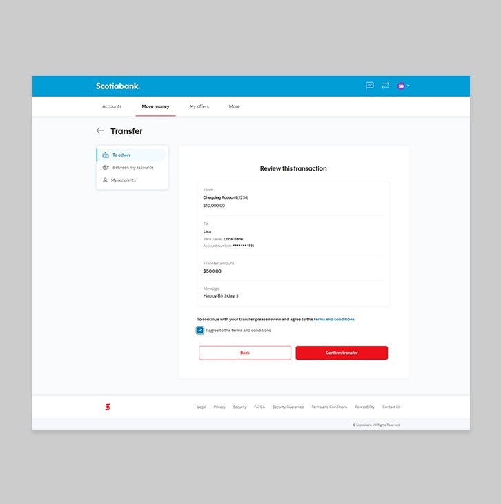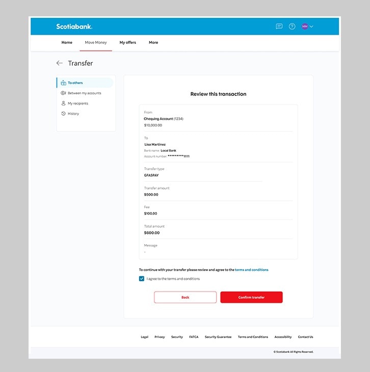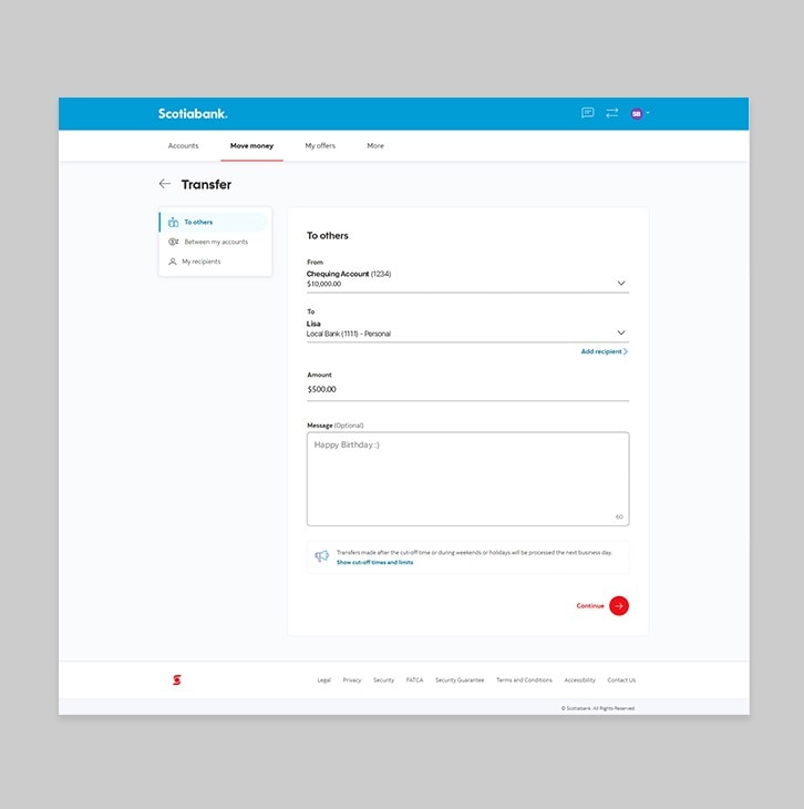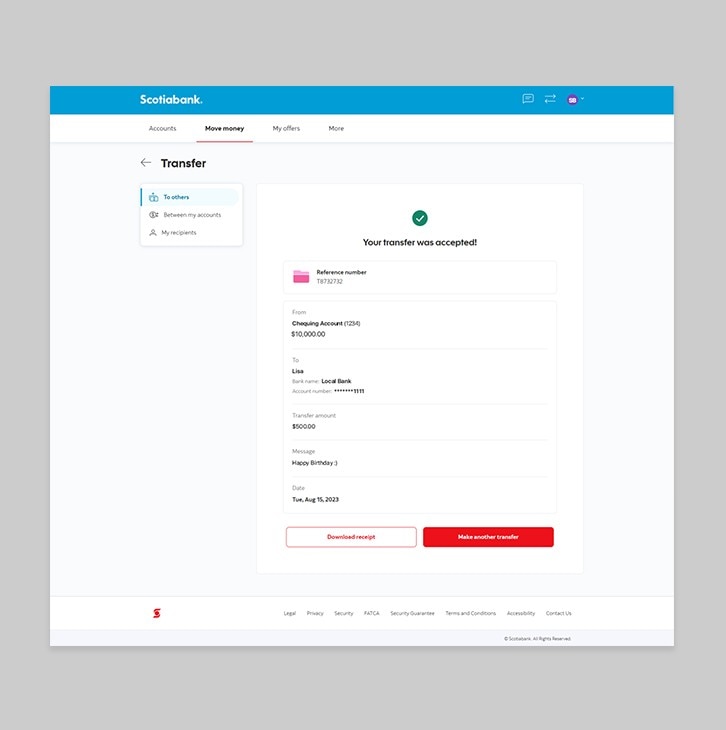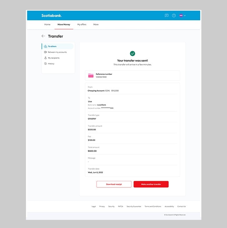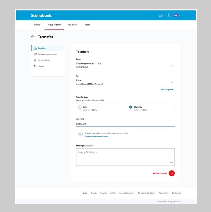 Keep track of your money electronically. Send and receive funds to Scotiabank accounts and other local bank accounts.