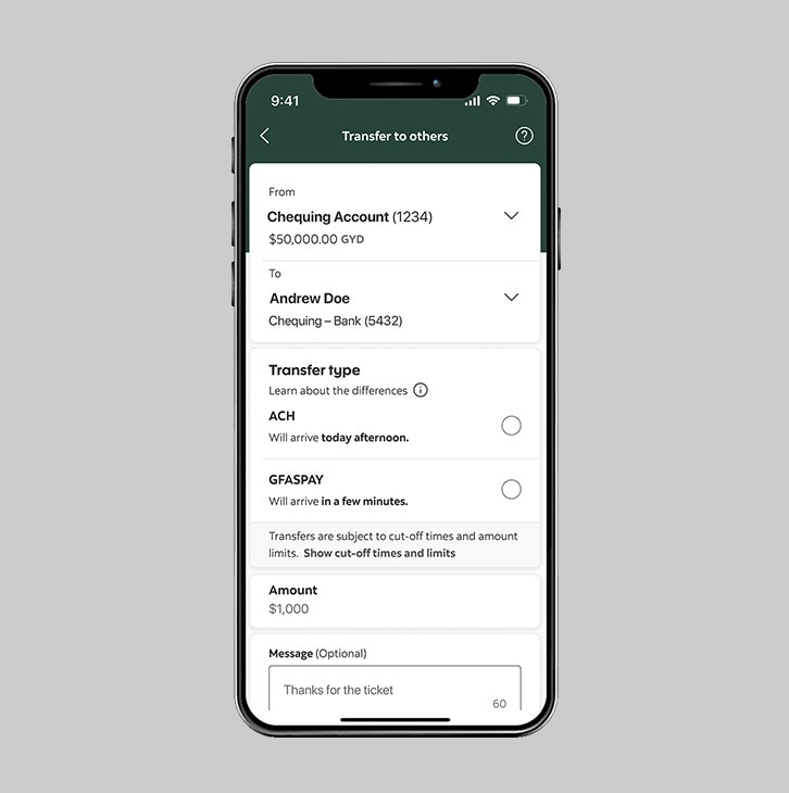 Note: Once selected, any funds set via GFASPAY to an account at another bank will be sent to the recipient within minutes.